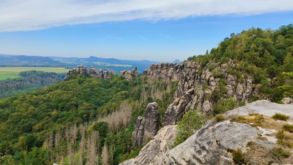 Net als veel andere gebieden in Duitsland heeft ook de Saksische Schweiz te maken met de boomschorskever. Dit kleine beestje vreet met name de schors van dennen aan waardoor de boom volledig kaal wordt. Gelukkig is er ook veel loofbos en doet dit niets af aan de schoonheid van de rotsformaties, uitzichten en dorpjes.